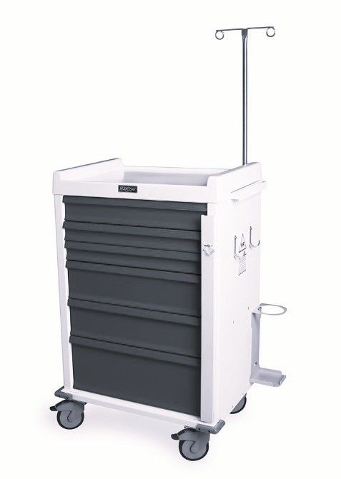 This MRI compatible crash cart has several great features that differentiate it from similar carts. All Harloff MRI carts are tested by an independent testing authority to 3 Tesla level and meets the American Society for Testing and Materials (ASTM) international designation of “MR-Conditional”. Cart drawers feature ball-bearing, full extension drawer slides and can be painted in any of up to twenty color options. This MRI compatible crash cart comes equipped with a breakaway locking bar with 100 numbered plastic seals included. The cart also features low-ferrous 5″ sealed ball-bearing casters, protective corner bumpers, a pull out shelf and a replaceable plastic top with integrated push handles. This model comes with an IV pole, cardiac board, oxygen tank holder, four utility hooks, and two adjustable drawer dividers with trays. Harloff offers several additional MRI compatible crash cart accessories to add to your cart that are easy to attach thanks to pre-threaded accessory mounting holes.